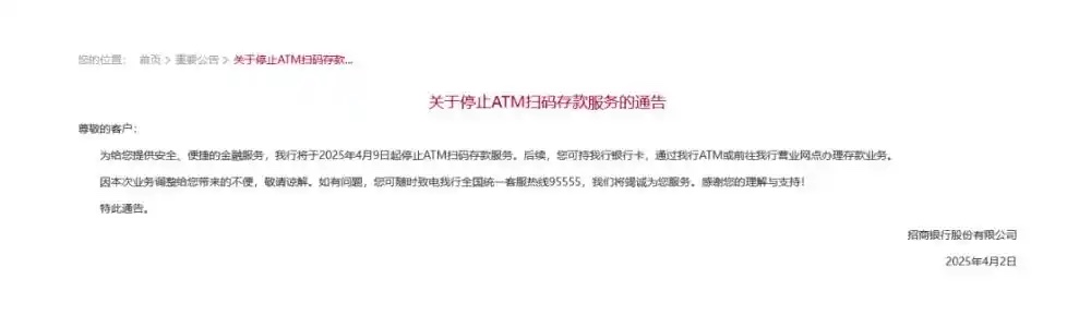 日前,招商银行发布公告称,该行将于4月9日起停止ATM扫码存款服务,后续,客户可持银行卡,通过招商银行ATM或前往该行营业网点办理存款业务。